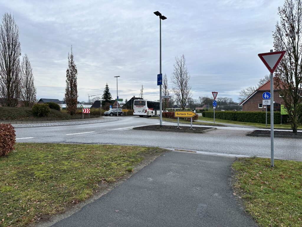 Auch innerorts gibt es Kreisverkehre, in denen die Fahrzeuge auf der Fahrbahn beim Ausfahren Vorfahrt haben. In Rastede trifft das auf den Kreisverkehr am Borbecker Weg zu: Radfahrende, die auf dem Fußweg fahren, müssen Vorfahrt beachten. Die Kraftfahrzeuge auf der Fahrbahn dürfen zuerst fahren.